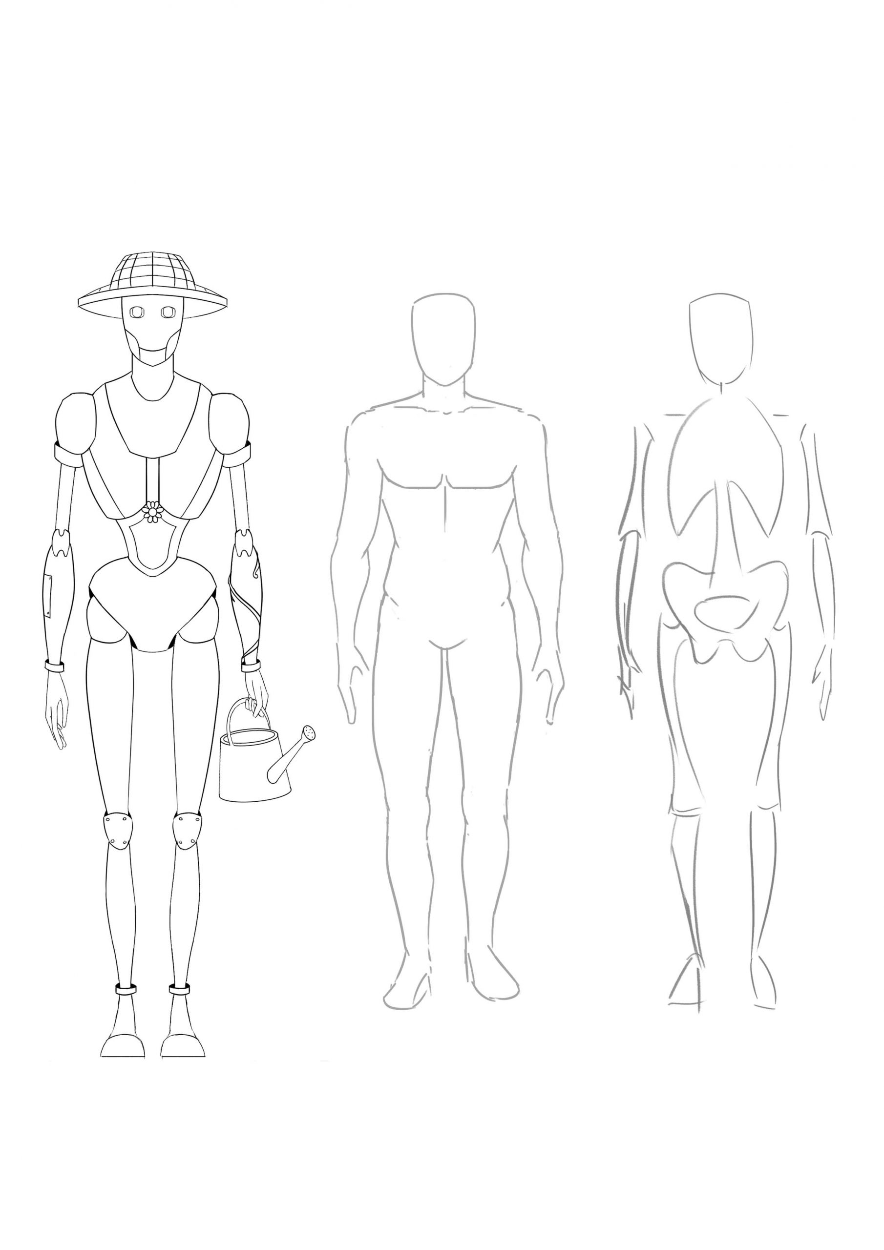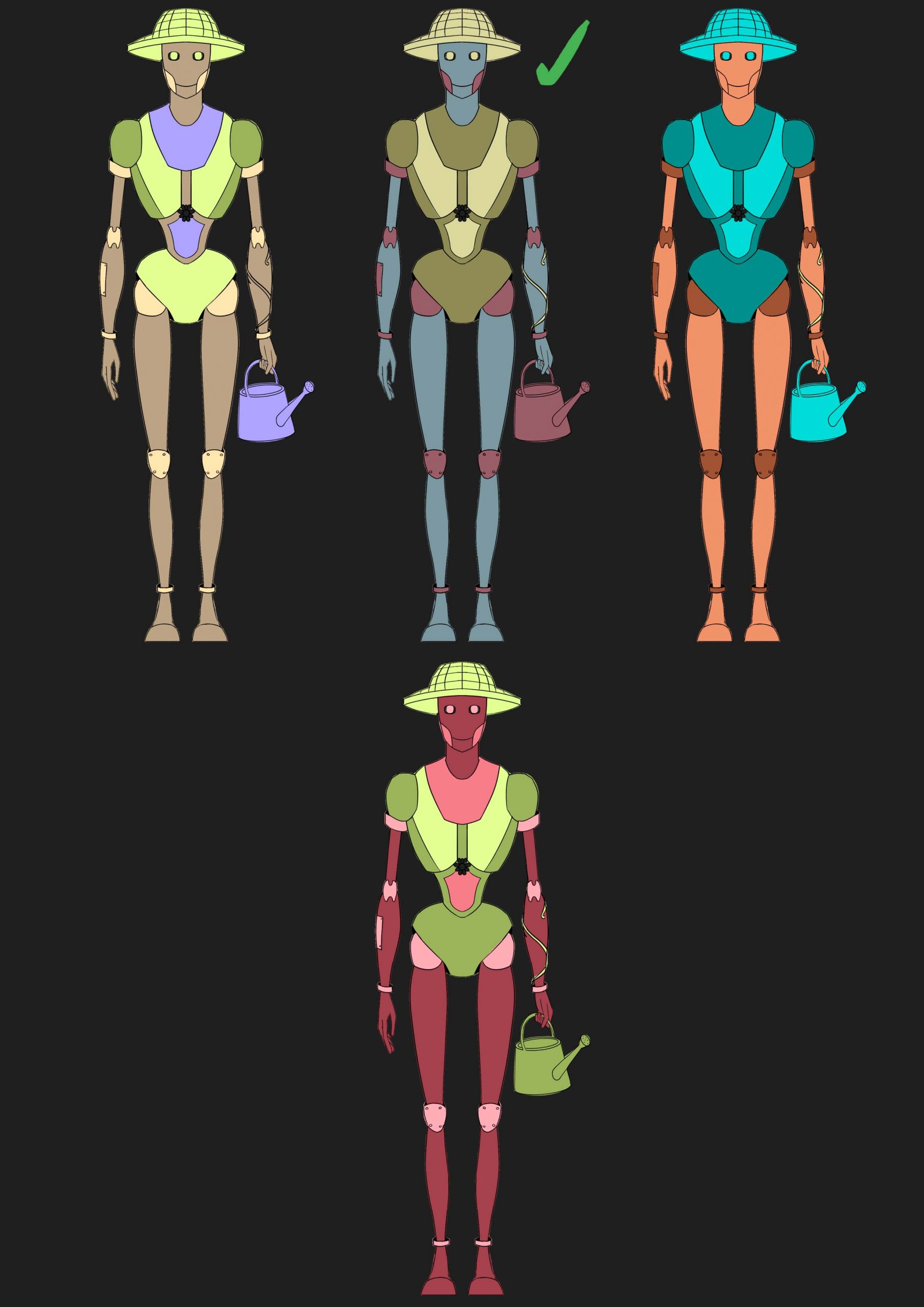 Concept Art de Silvestre, robot doméstico aficionado a la jardinería 🙂 Diferentes pruebas de color de la armadura Evolución de la adaptación física desde un esqueleto humano hasta la estructura robótica Conoce la historia de Silvestre ¿Te gusta? Compártelo :)
